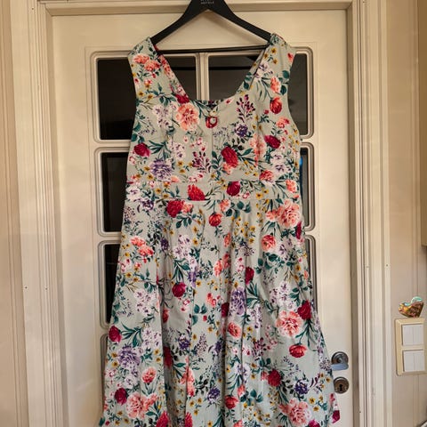 En riktig glad kjole. Turkis bunn med 60-talls dtiliserte blomster og blader i blått, gult og grønt.