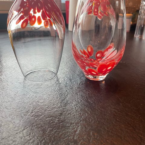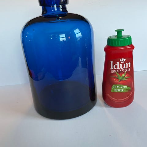 Blå glassvase og krukke med lokk i blått glass med hvite blomster