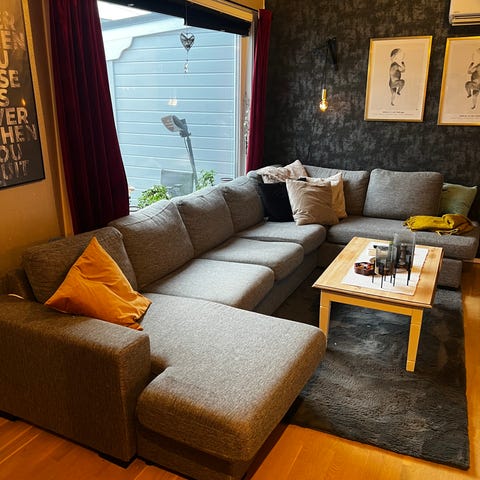 Stor og veldig(!) behagelig sofa selges da sjeselongen blir på feil side i nytt hus..