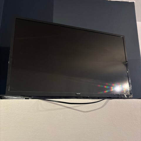 Philips TV i svart farge. Produktet har en flat skjerm og en tilkoblingskabel. Mangler fjernkontroll men knappene på siden fungerer til lyd og bytting av kanaler. Brukt med chromecast i garasje