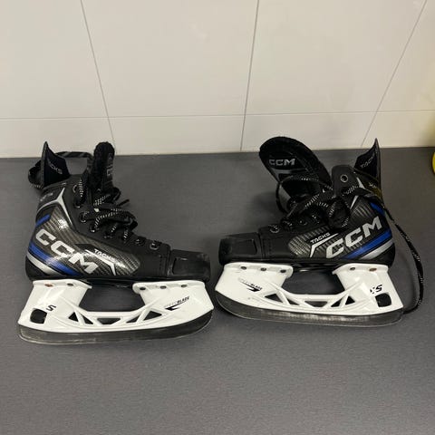 CCM Barne Hockeyskøyter størrelse 35, designet for ishockey. Skøytene er svarte med hvite lisser og har en regular bredde. Og svart hockeyhjelm med gitter for ansiktsbeskyttelse.