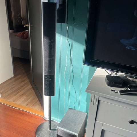 Pioneer 43’ plasma tv fra 2006 med veggfeste og hjemmekinoanlegg med tilhørende høyttalere og subwoofer. Systemet inkluderer to høyttalere på stativ, to små høyttalere en senterhøyttaler og en subwoofer. Brukt til spill siste årene og fungerer
