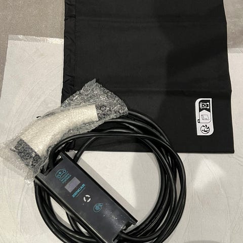 Type 1 ladekabel for elbil, plugg på ladesiden er type-2. Kabel er intakt og isolasjonskappe er uskadet.