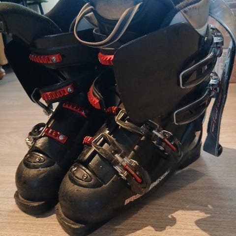 Nordica skistøvler i grønn og svart farge. Utstyrt med fire spenner og borrelås for justering. Passer for alpinski.