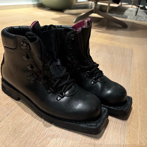 Fjellski sko i skinn. Høy kvalitet, men slitt i læret, så må pleies godt
