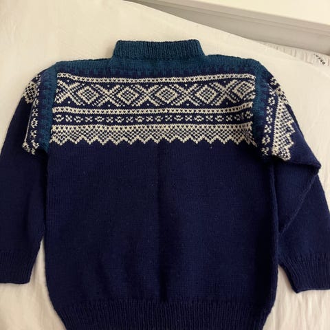 Blå marius genser med hvit og rødt mønster, med tilhørende lue. Nydelig genser i myk merino ull.