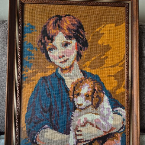 Koselig bilde av en bjørn i tovet ull og brodering ,33x42 cm,99584193