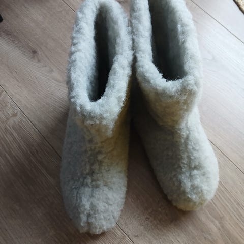 Strikket overdel i ull med tykt ullfôr og slitesåle i gummi for godt grep. Størrelse 39, men litt små og smale i passformen, passer best til smale føtter i størrelse 38/39. Kun prøvd innendørs og lappen er beholdt på. Ny pris 799 kr