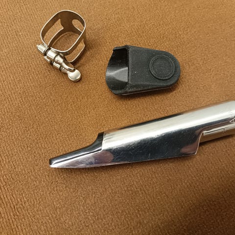 A vintage T stamped Otto link Florida ligature and cap, fits metal Otto link mouthpieces and some other metal mouthpieces,will not fit Guardala as I tried with mine.
