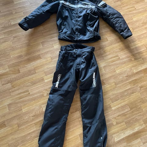 Inkluderer jakke og bukse med beskyttende ryggplate. Kan også få noen kjøre hansker som jeg har liggende med på kjøpet i str M.