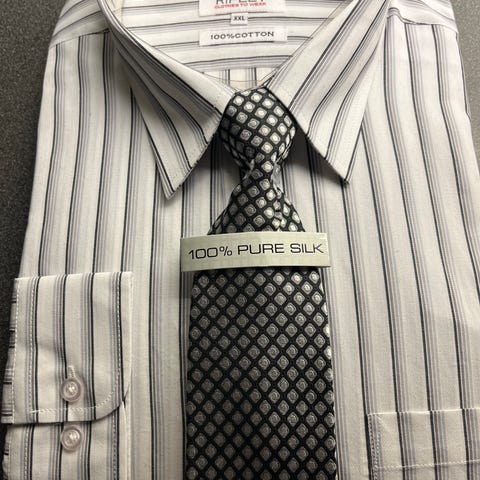 Skjorten har et svakt stripemønster og knappelukking foran.