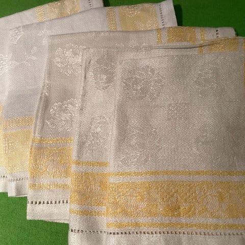 I den ensfargete kanten (7-10cm) er stoffet ganske tynt. Mønsteret (som utgjør hoveddelen) er damaskvevet og kraftigere. På to av håndklærne er det ensfarget kant på begge kortsidene og den ene langsiden. På det tredje er det ensfargeet kant på begge kortsidene.