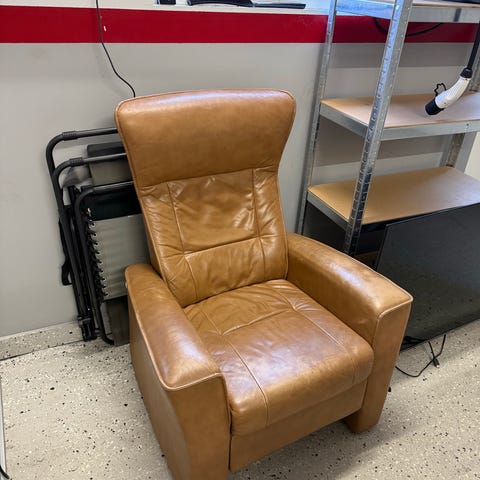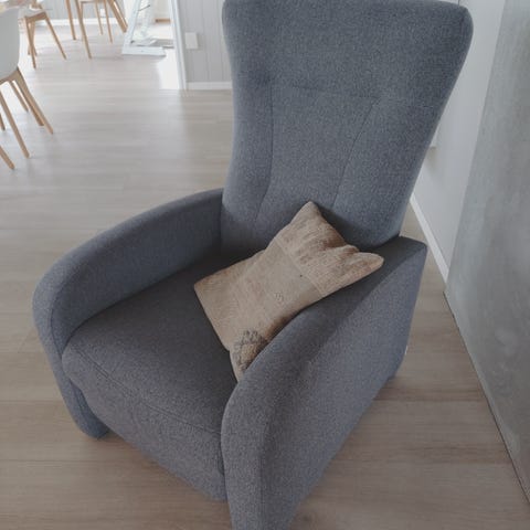 Fin stol og skammel uten merker. Må hentes.