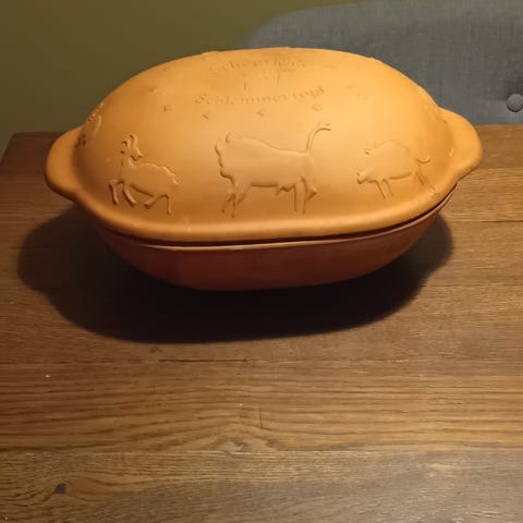 Bunnen måler 30 cm i lengde og 20 cm i bredde. Scheurich keramik 808 Germany (Römertopf/Schlemmertopf).