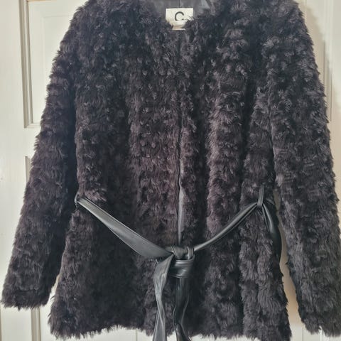 Vila Annet yttertøy i svart fuskepels, størrelse 40 for dame. Jakken har et belte i livet og er laget av kunstig pelsmateriale.