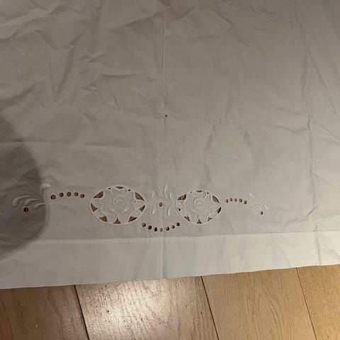 Gammel rund duk i hvit farge med dekorative broderier og hullmønster. Duken er laget av tekstilmateriale og egnet for bruk som borddekorasjon.