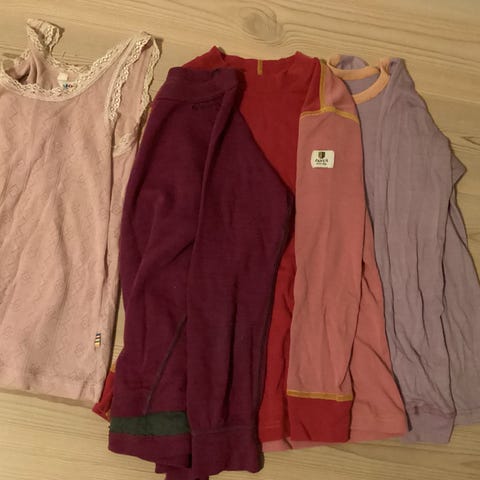 To par med rosa / gule ullundertøy sett med bukse og genser, Reima, ull / viscose. Ett sett 130, det andre 140. 100 kr per sett. SOLGT begge to!
