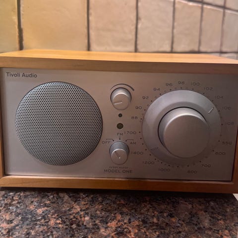 Audio Technica Model One radio med trepanel og analogt kontrollpanel. Radioen har justerbare innstillinger for frekvens og volum, samt innebygd høyttaler. Designet med retrostil og brukervennlige knotter for enkel betjening.