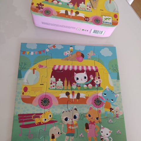Djeco Puslespill med 24 brikker, laget i tykk papp. Koselig motiv og farger. Det er brukt, noen brikker med litt kant skade. Passer for barn 3+ år.