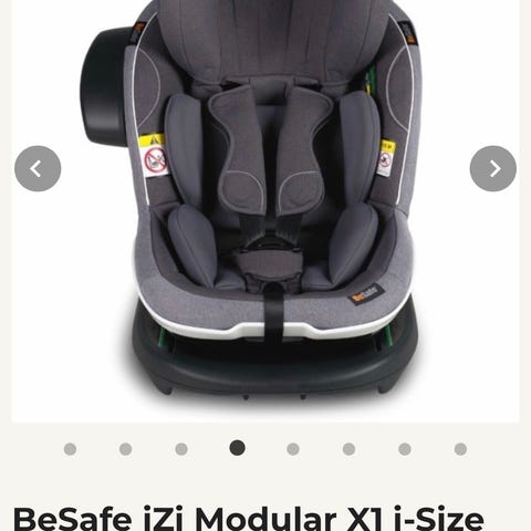 Merke og Modell: BeSafe (et norsk merke). Stolen er festet til en iZi Modular i-Size base (som indikerer at den oppfyller den nyeste europeiske sikkerhetsstandarden ECE R129/i-Size).