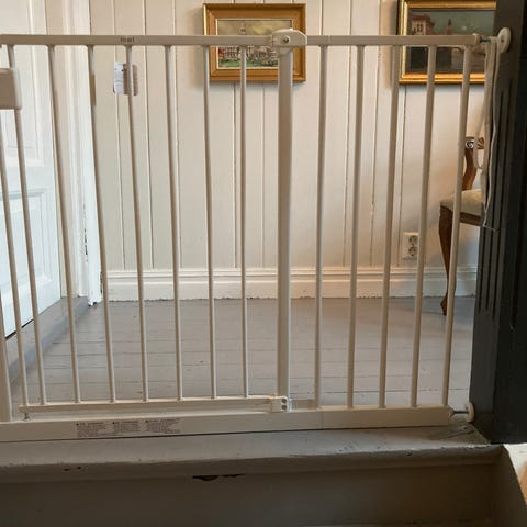 Selger en sikkerhetsgrind som ikke trenger å skrues i vegg eller trapp. Det er inkludert ekstra lengder for å dekke en større åpning. 75-80 cm + 21 cm + 9 cm.