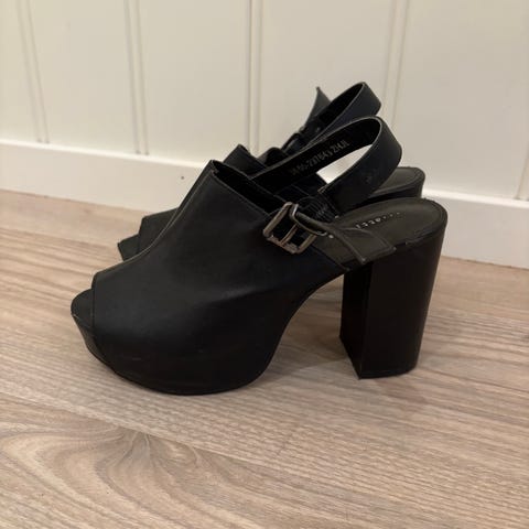 Nelly Hæler sko i størrelse 38. Skoene er svarte og har åpen tå og hæl med ankelstropp. Pent brukt ved et par anledninger. Selges da de ikke passet min fot helt. Skoene er litt støvete men ikke skitne. Kan fint vaskes bort.