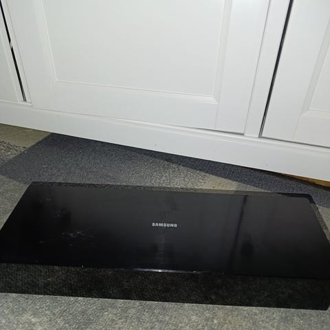 Samsung One Connect Box med tilhørende fjernkontroll. Enheten har flere tilkoblingsmuligheter inkludert HDMI-porter og optisk lydutgang. Designet for å koble til og styre Samsung TV-er, og gir enkel tilgang til eksterne enheter.