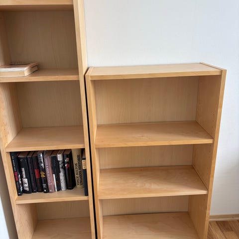 3 stk Billy-hyller til salgs. 2 stk i utgått bredde (60cm), alle i utgått farge (bjørk).