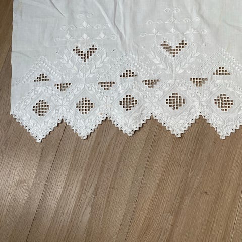 59,5x 74 når det henges opp. Brukt som duk er det 112 cm langt. Broderte initialer A. L. Meget dekorativt. Jeg skulle selvsagt strøket det, men driver ikke med slikt.