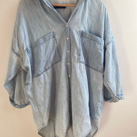 Selger en blå oversized skjorte fra Zara i størrelse M. Komfortabel passform og lett å style, brukt pent og i god stand.