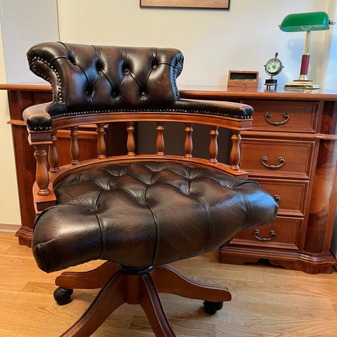 En flott og staselig stol i mørk brun av ypperste skinn. Kapteins stol. Captains chair.