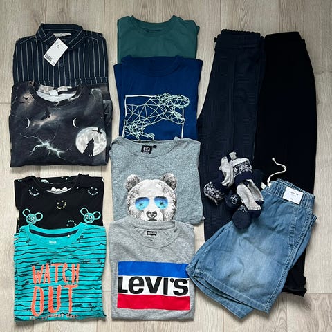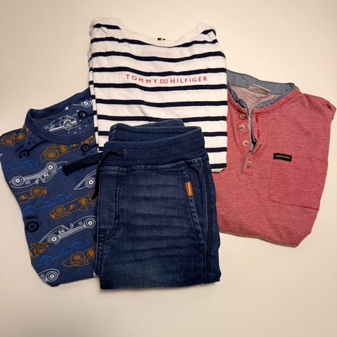 GUESS barneklær for gutt i størrelse 140 med flerfarget design. Inneholder flere plagg med ulike mønstre og farger, inkludert hettejakker og gensere i varierende materialer. Jakke er str.146