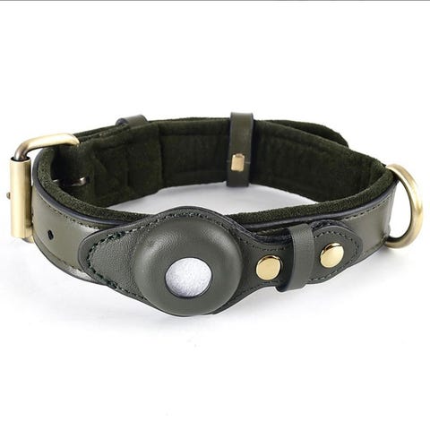 Apple AirTag sporingsenhet med oransje halsbånd i tekstilmateriale. Halsbåndet har justerbar størrelse og svart spenne, egnet for bruk på kjæledyr.