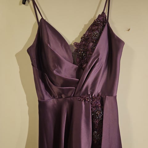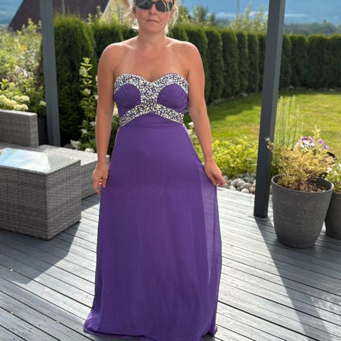 Vintage ballkjole med one shoulder og splitt 🩶 Ingen størrelse eller stofflapp, men vil si den tilsvarer en S. Fargen er grå-blå. Pent brukt og i bra stand.