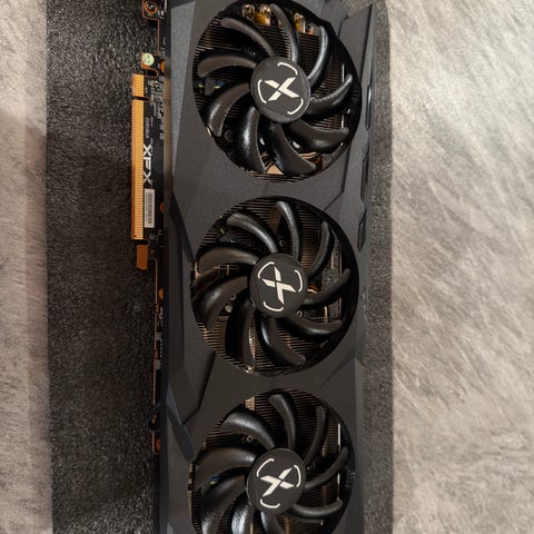 XFX Radeon RX 6900 XT skjermkort med tre vifter for kjøling. Kortet har HDMI-utgang og er designet for høy ytelse i grafikkintensive applikasjoner.