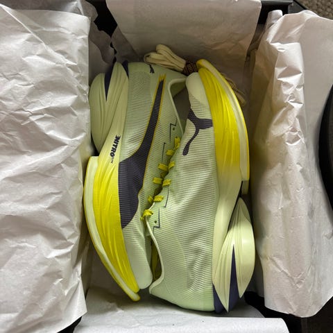 Puma Nitro running sko i oransje farge, størrelse 43. Designet for løping med fokus på ytelse og komfort.