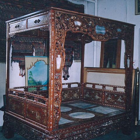 De keramiske knottene med blomster- og fuglemotiv gir møbelet et særpreg og et koselig, klassisk uttrykk. Overflate og konstruksjon er i god vintage stand, med normale alders- og bruksspor som understreker møbelets alder og autentiske karakter.