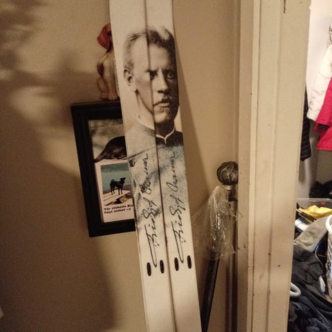 Skiene har til sammen gått 3-4 mil, fordelt på 2 ungdommer og flere sesonger.
