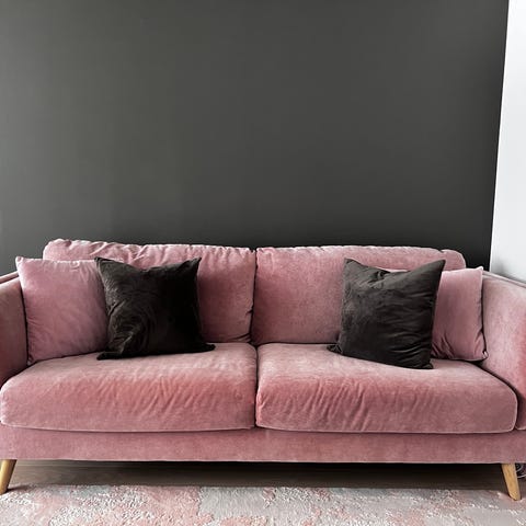 Sofaen er en fire-seter med avtagbare og vendbare puter. Metallben og grått melert trekk som kan vaskes. Behagelig sofa som passer bra der det kanskje ikke er plass til hjørnesofa.