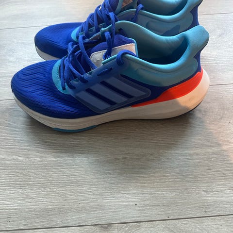 Adidas løpesko i størrelse 40 med hvit og grønn farge. Skoene er designet for løping og har mesh-materiale for pusteevne. Sålene viser noe bruk, men skoene er generelt i god stand.