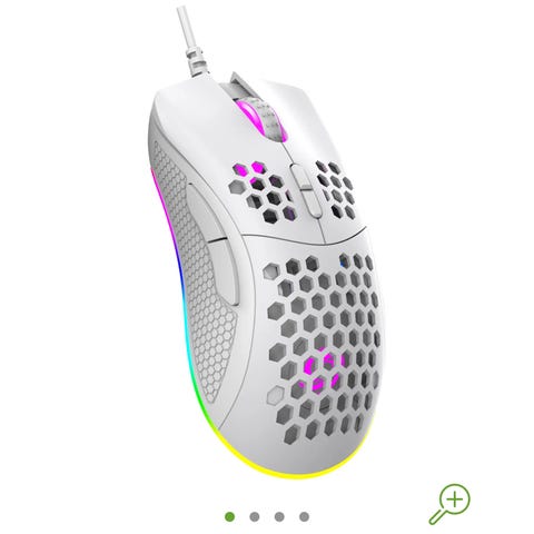 Roccat Kone AIMO gamingmus med kablet USB-tilkobling. Musen har en hvit farge og flere programmerbare knapper. Egnet for bruk med datamaskiner for spill og generell bruk.