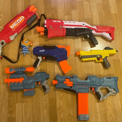 Nerf Blasters og tilbehør inkludert flere modeller av håndholdte blasters, piler i ulike farger og størrelser, samt magasin for ammunisjon.