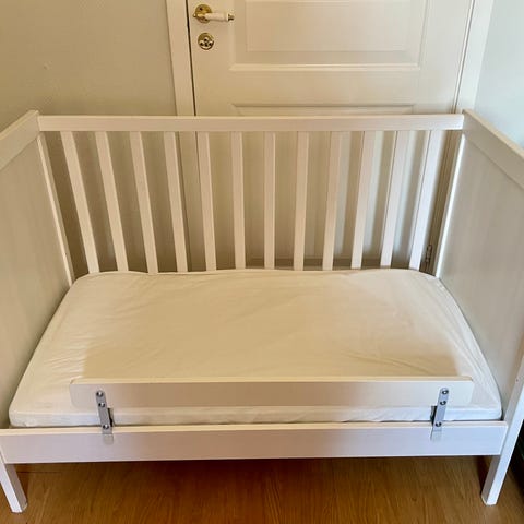 Pent brukt Sundvik sprinkelseng fra IKEA selges pga overgang til ny seng. Noen bruksmerker sees og noen skruermerker i den ene enden av senga. Både sideveggen (ikke avbildet) og sengehest følger med. Madrassen følger også med. Alltid brukt madrassbeskytter, selve beskyttelsen og laker kan gjerne følge med.