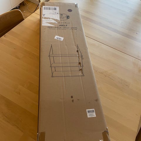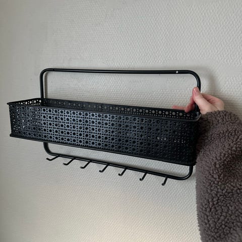 Uten bruksmerker. Minimalistisk sort hylle i metall og tre.