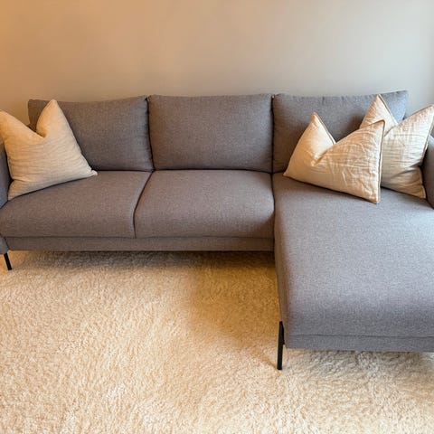 Selges fordi vi vil ha ny plass til både sofa og lenestol. Merket er Scapa. Sofaen ble proft renset av et byrå høsten 2025. Sofaen har dobbel sjeselong som er super digg sitte og ligge i! Vi har også brukt den som sofasofa for gjester.