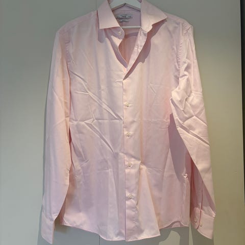 Mango skjorte i størrelse L, blå farge og laget av bomull. Skjorten har detaljer i rutemønster på innsiden av krage og mansjetter. 150kr + frakt.