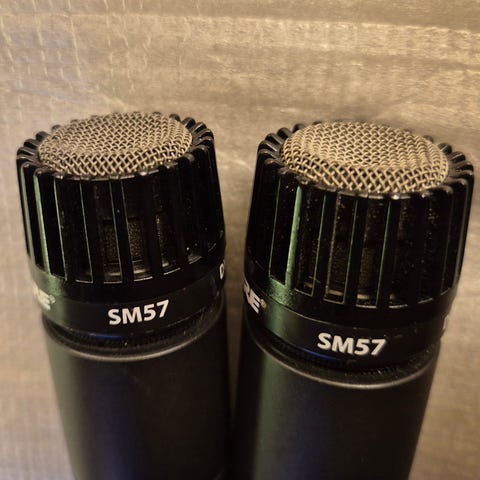 Shure SM57 mikrofon inkludert etui, manual og mikrofonklemme. Mikrofonen er designet for profesjonell lydopptak og scenebruk.