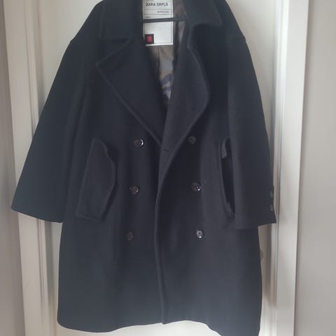 Nydelig lang blazer fra Zara i grå ull med fiskebensmønster, størrelse XL for dame. Har innsvinget fasong (tailored stil) og når meg til midt på låret(jeg har kort overkropp). Jakken er laget av 100 % lammeull og fôr i acetat. Kan brukes som blazer innendørs på vinteren og utendørs på våren/høsten! Pent brukt, selges fordi den ikke brukes nok.
