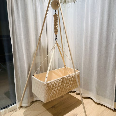 - Karmbeslag til å henge opp vuggen i døråpninger (kom til stor glede når vi besøkt venner og familie, så slipper man å pakke sammen hele stativet!)