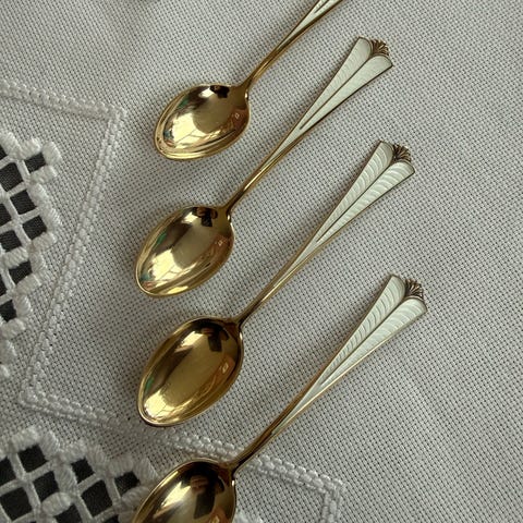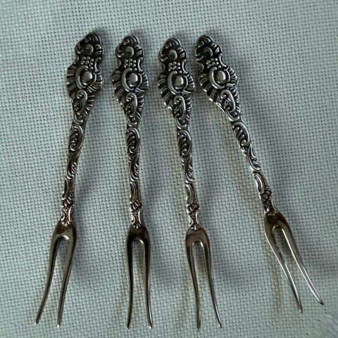 6 store, fine suppeskjeer i 830 sølv. Ulike mønstre og produsenter. Alle er ca 20 cm. Samlet vekt er 222 gram.